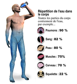 Le corps humain est composé à 65 % d'eau. Il ne faut donc pas attendre d'avoir soif pour boire. On constate sur le schéma ci-dessous les effets néfastes de la déshydratation qu'il faut à tout prix éviter.